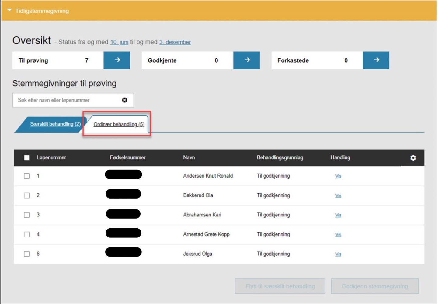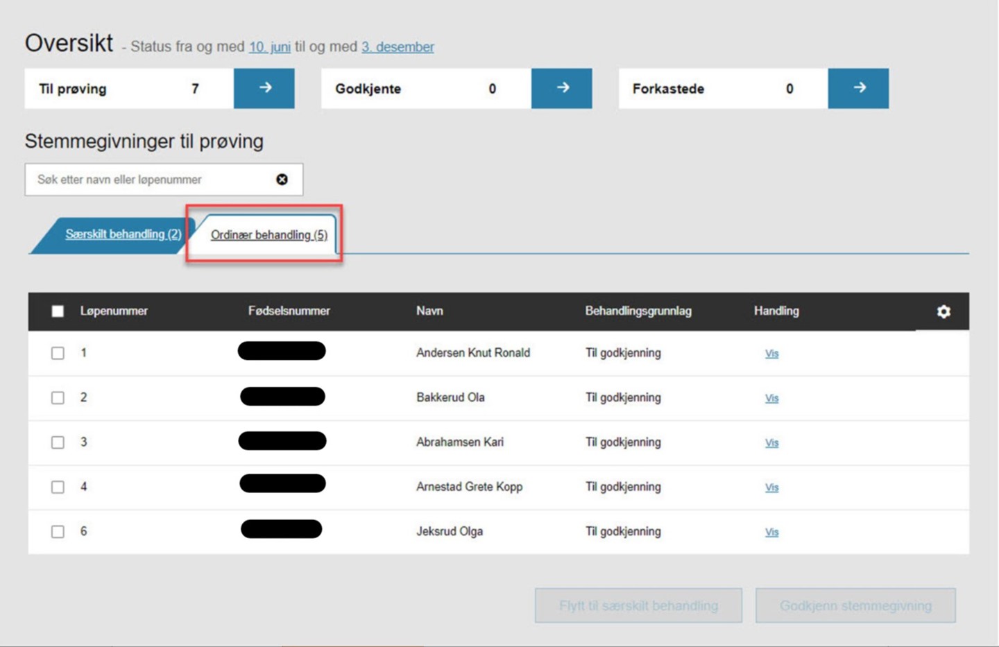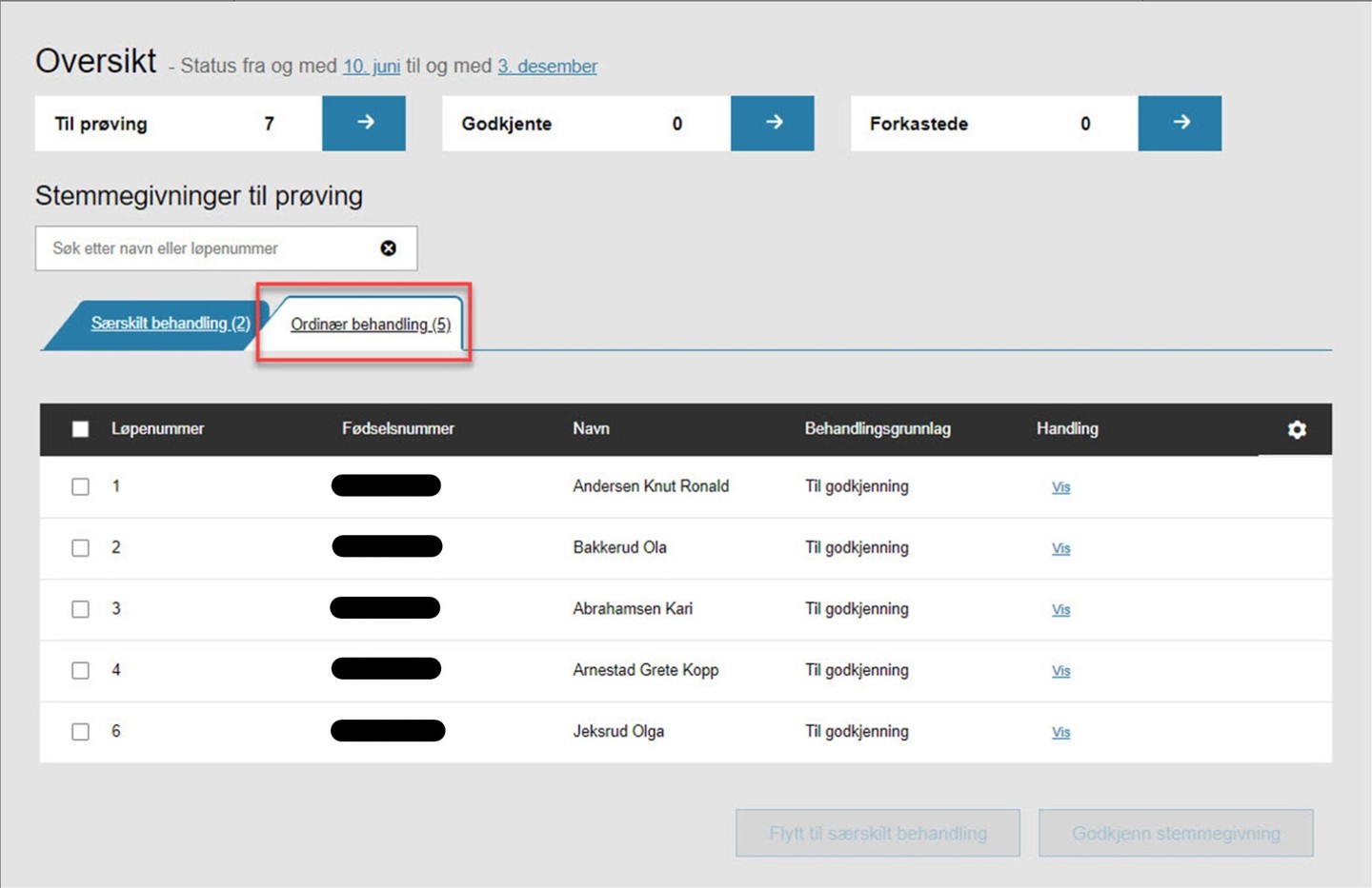 Alle stemmegivninger som er ordinære, og hvor EVA ikke finner noen spesielle forhold knyttet til stemmegivningen, vil vises under fanen "Ordinær behandling".