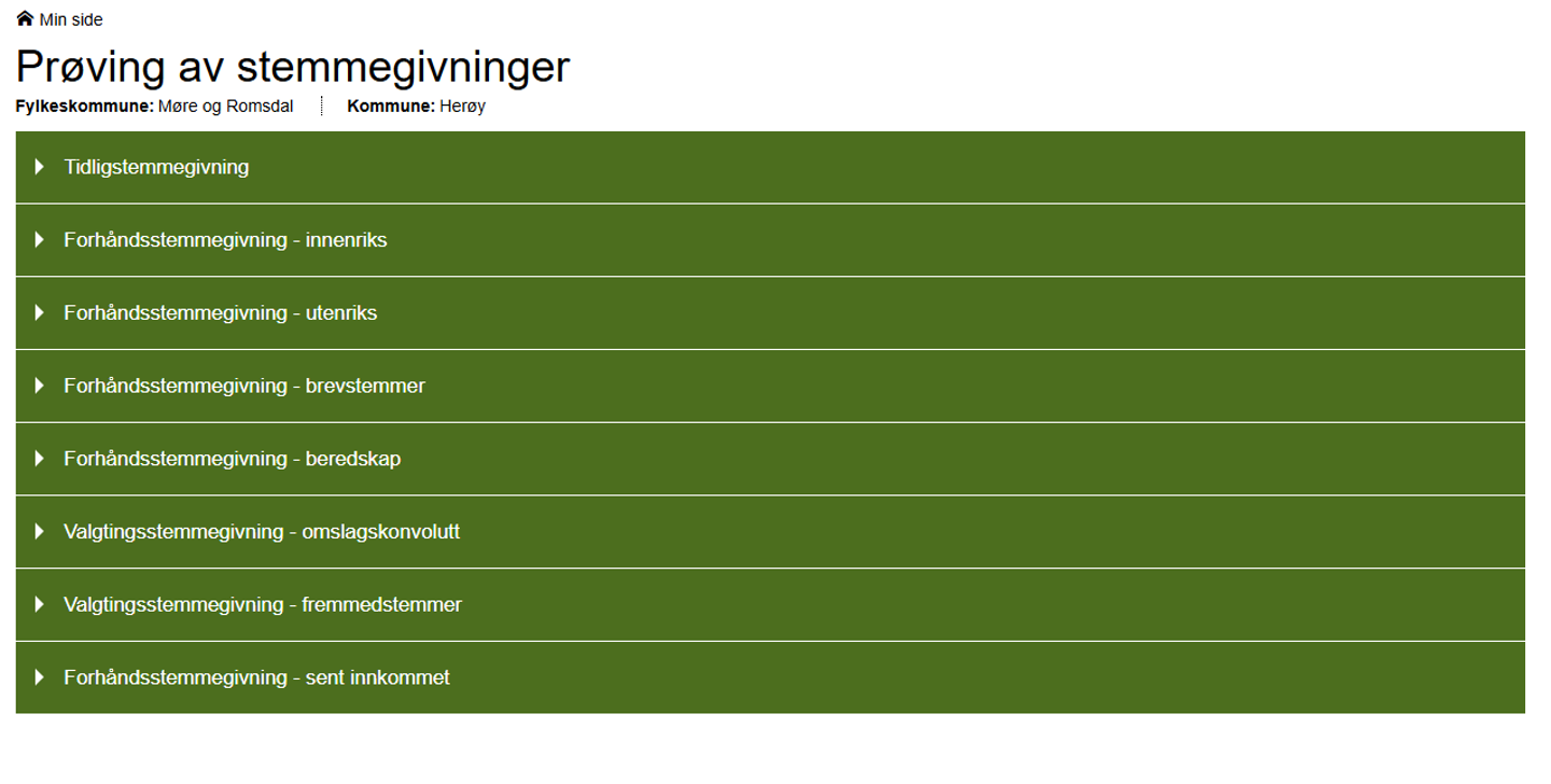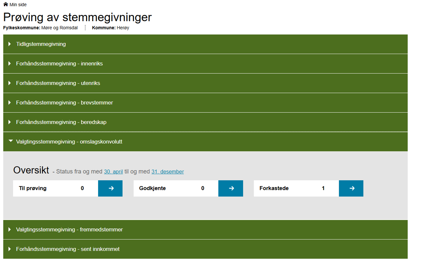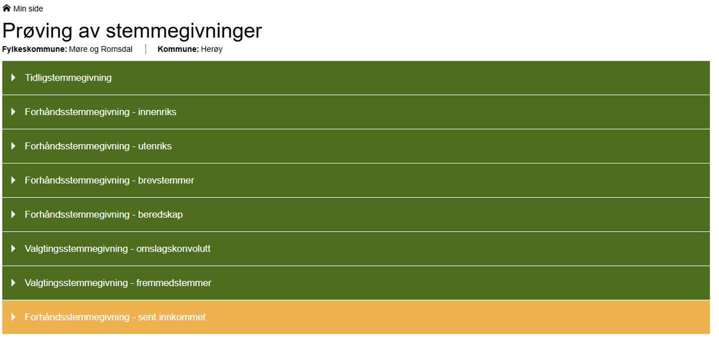 Tirsdag etter valgdagen kl 17.00 og når alle stemmegivninger som ligger til prøving er godkjent, skifter fanen knyttet til vedkommende stemmetype fra oransje til grønn.