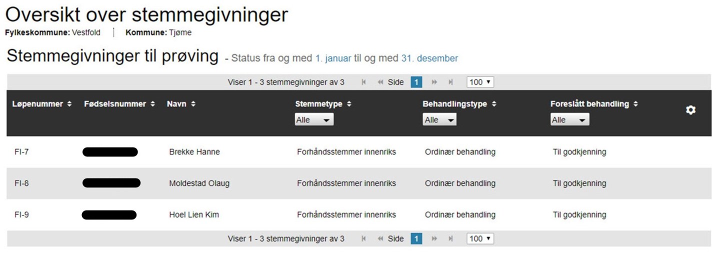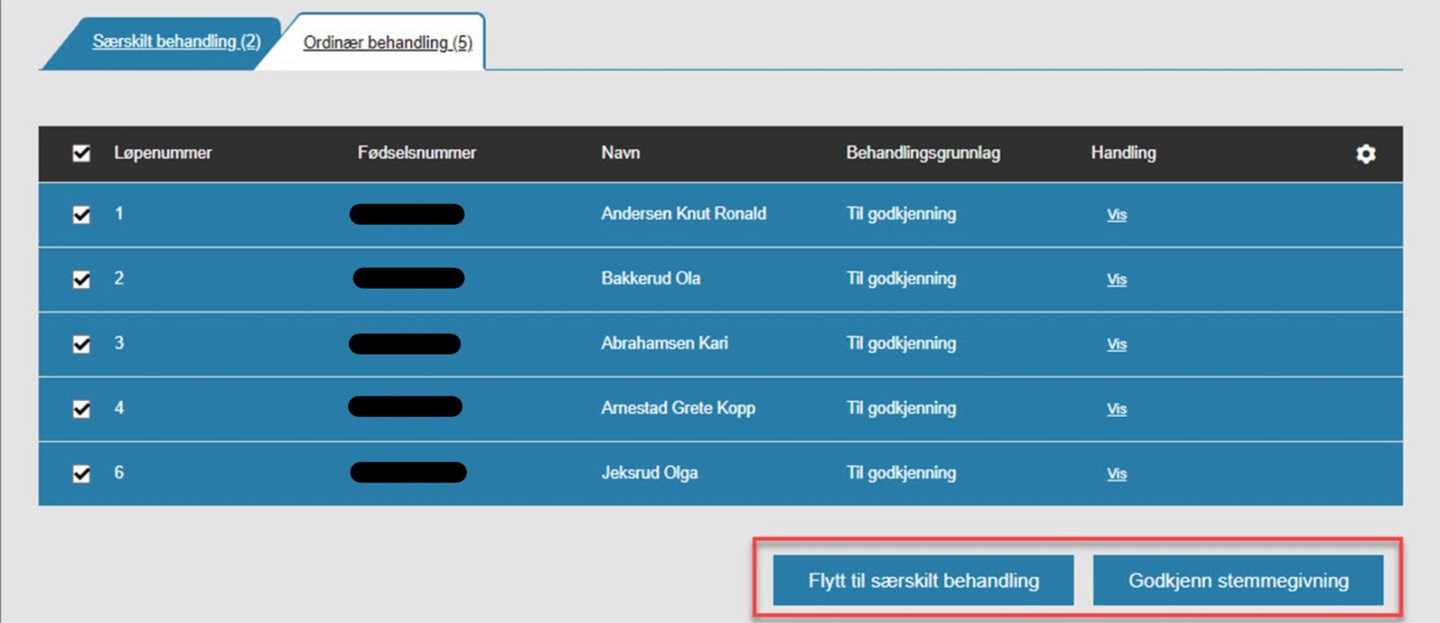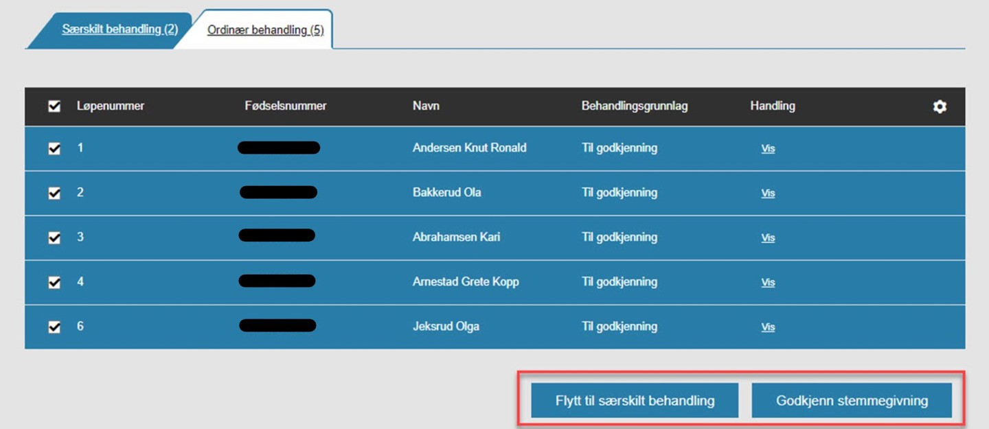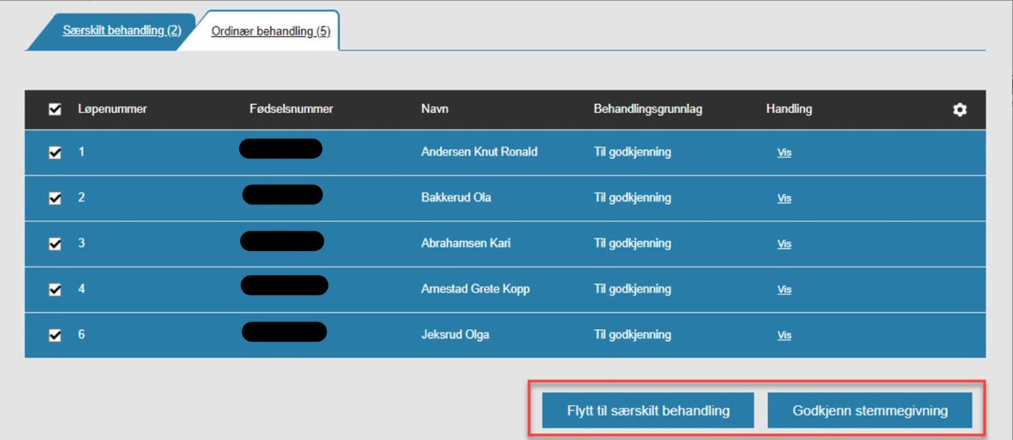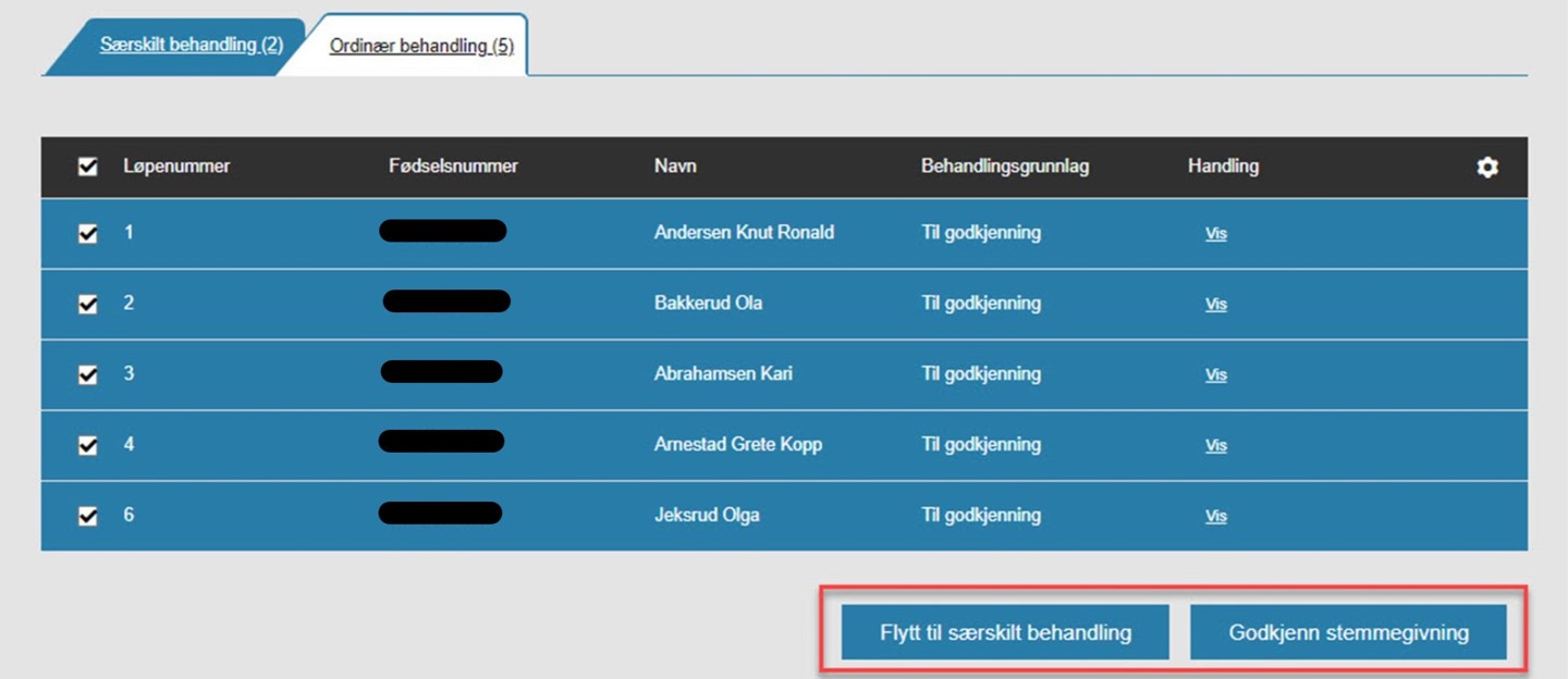 Stemmegivninger som skal behandles ordinært kan godkjennes enkeltvis eller samlet. Samlet prøving gjør du ved å markere en eller flere velgere og klikke på "Godkjenn stemmegivning". Dette fører til at stemmegivningene blir godkjent og det settes elektronisk kryss i manntallet knyttet til velgerne.