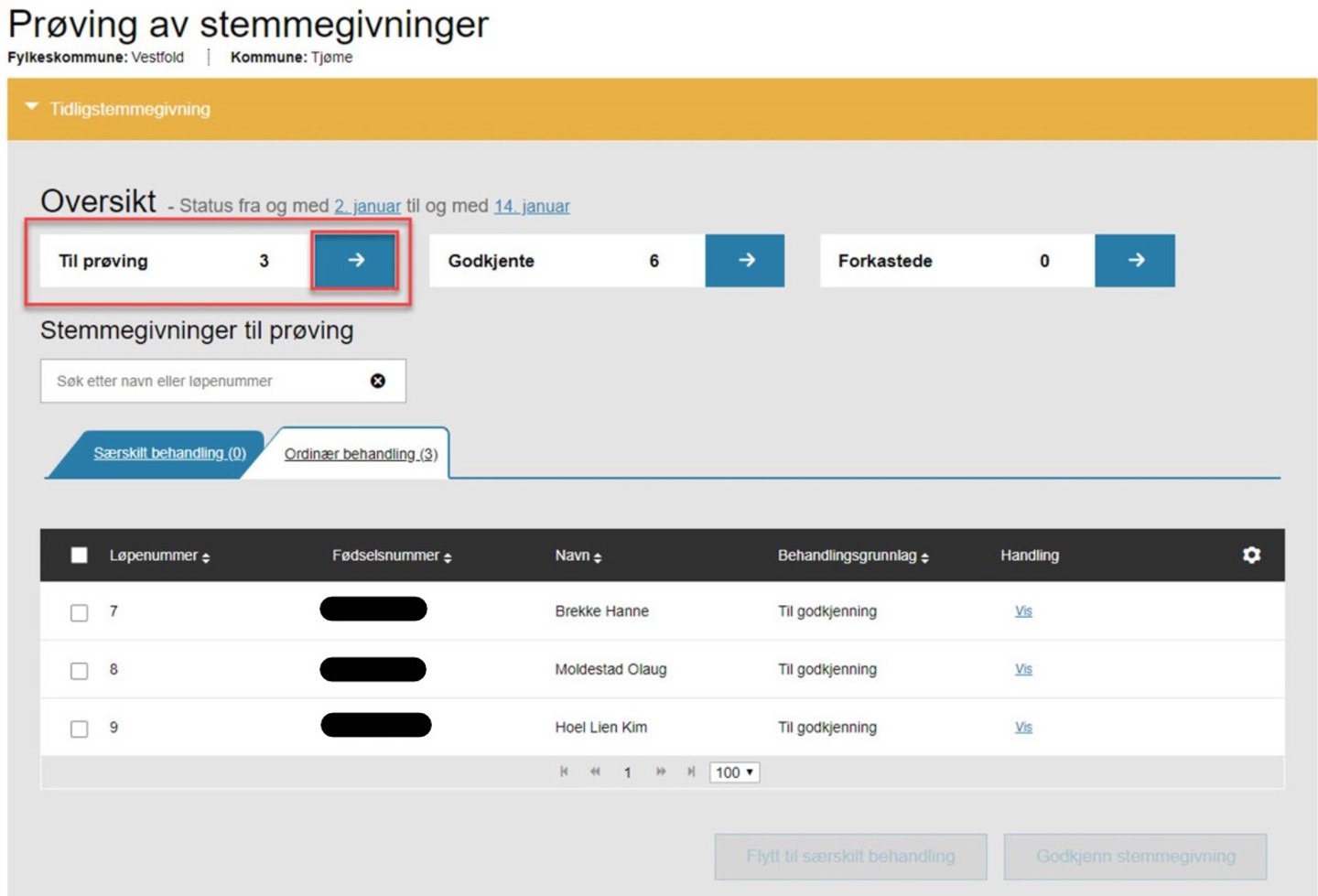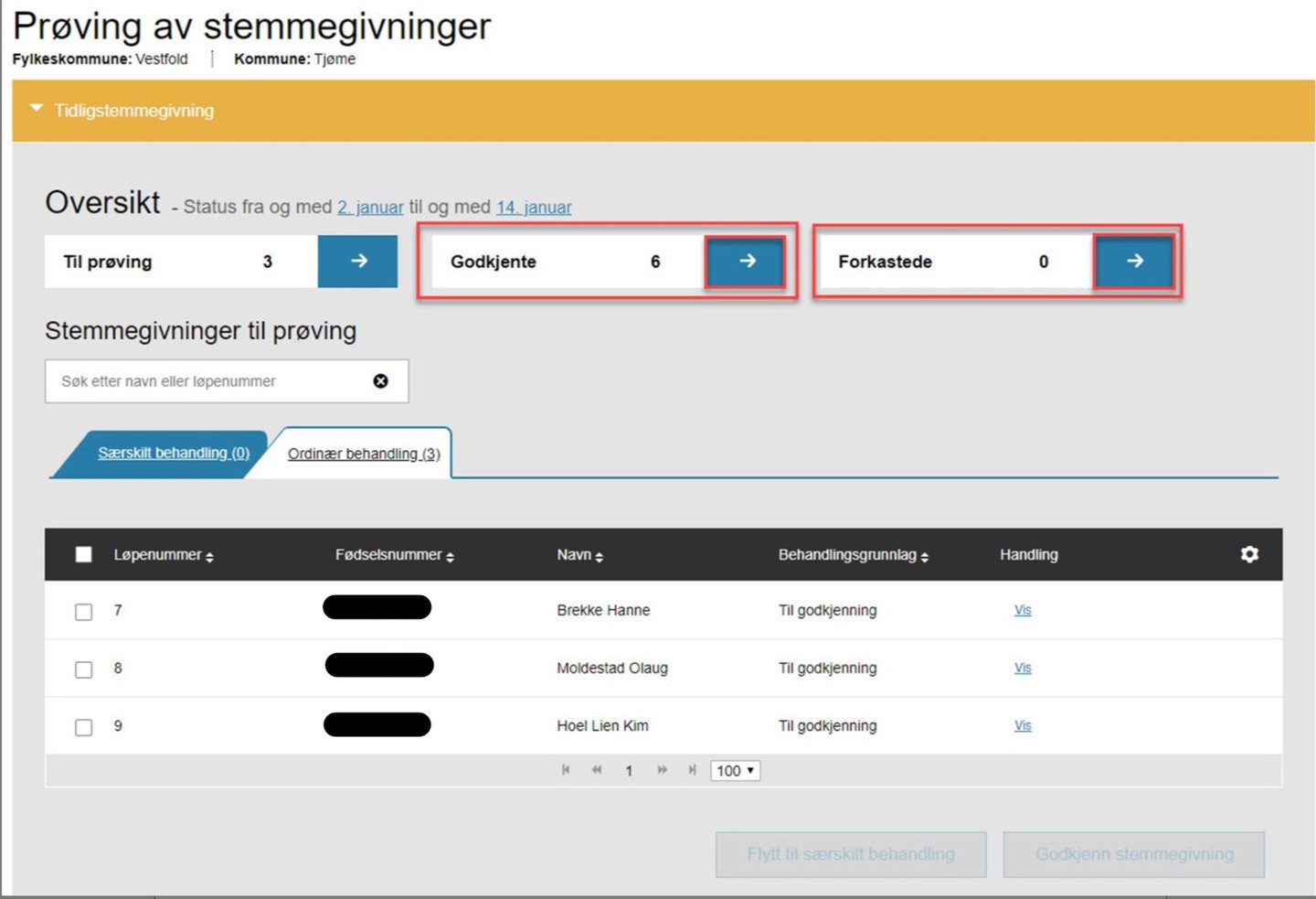 Du kan også gå inn i oversikten via "Stemmegivninger til prøving" ved å klikke til høyre for enten "Godkjente" eller "Forkastede".