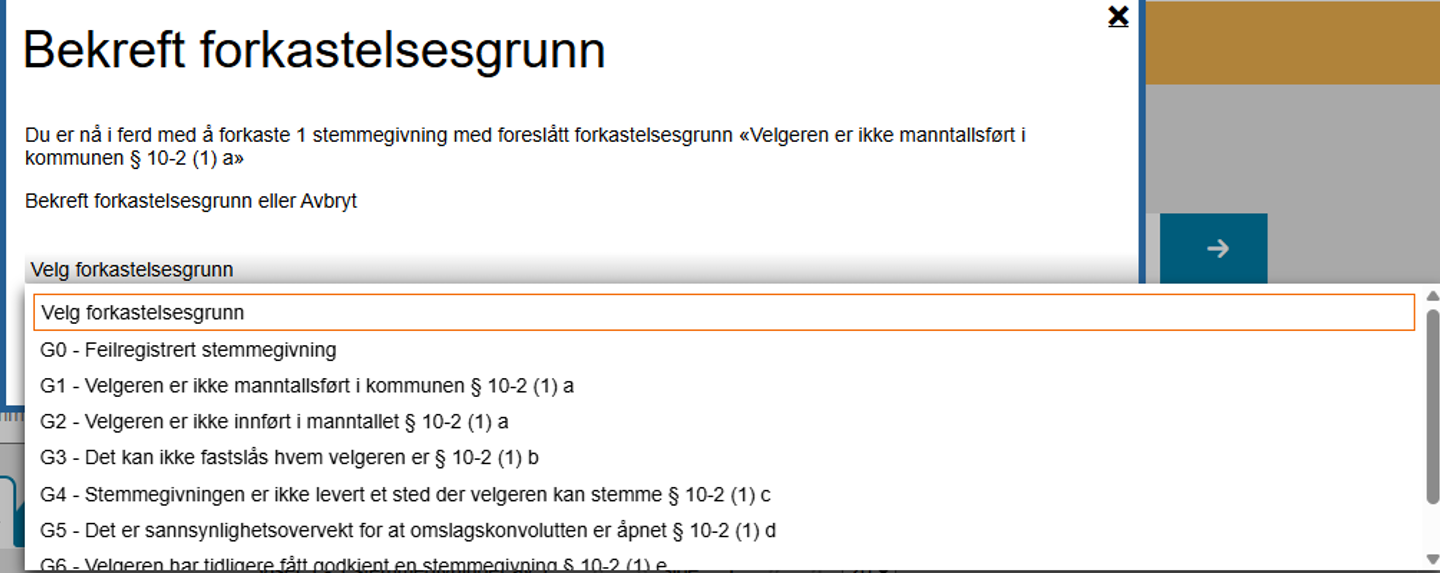 Når en eller flere stemmegivninger skal forkastes må du bekrefte forkastelsesgrunnen. Forkastelsesgrunnene vises i valgstyrets protokoll.