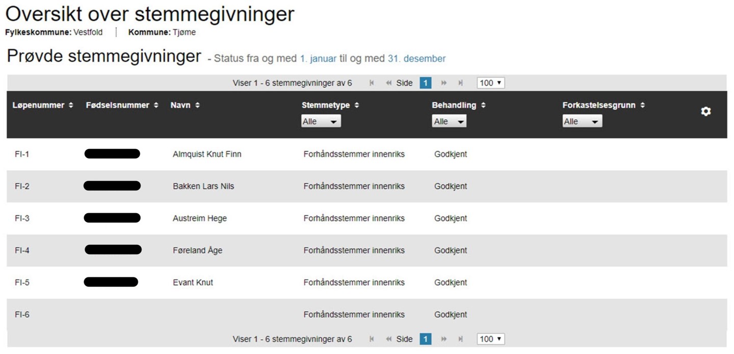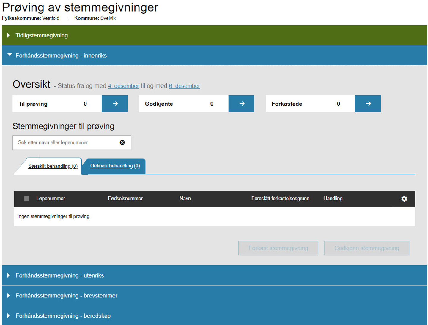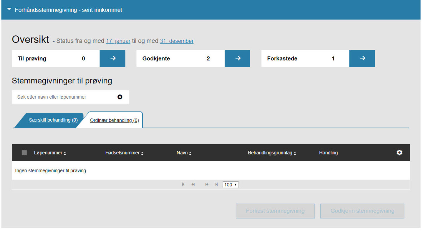 Merk! Hvis dere benytter papirmanntall må sent innkomne forhåndsstemmegivninger godkjennes fra denne oversikten - enten enkeltvis eller samlet. Fra velgerens personkort er det kun mulig å avvise stemmegivningen enkeltvis.