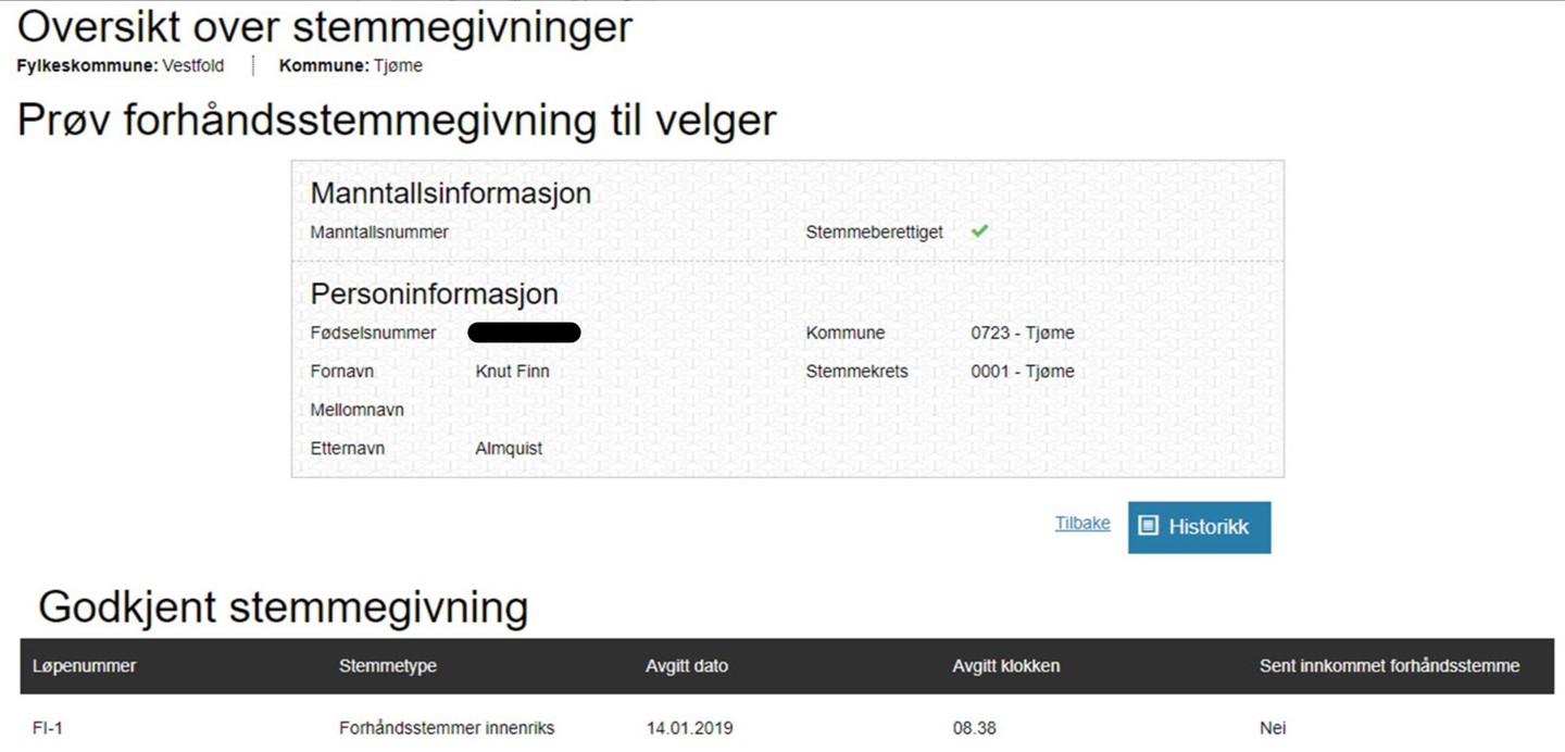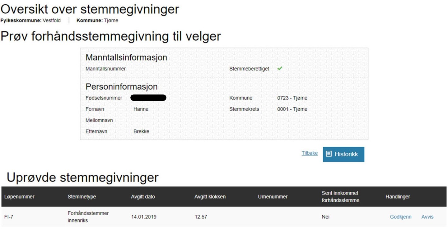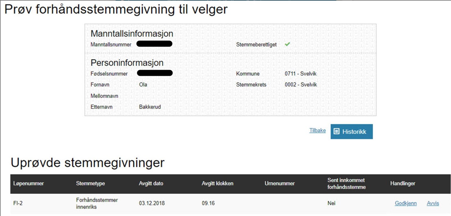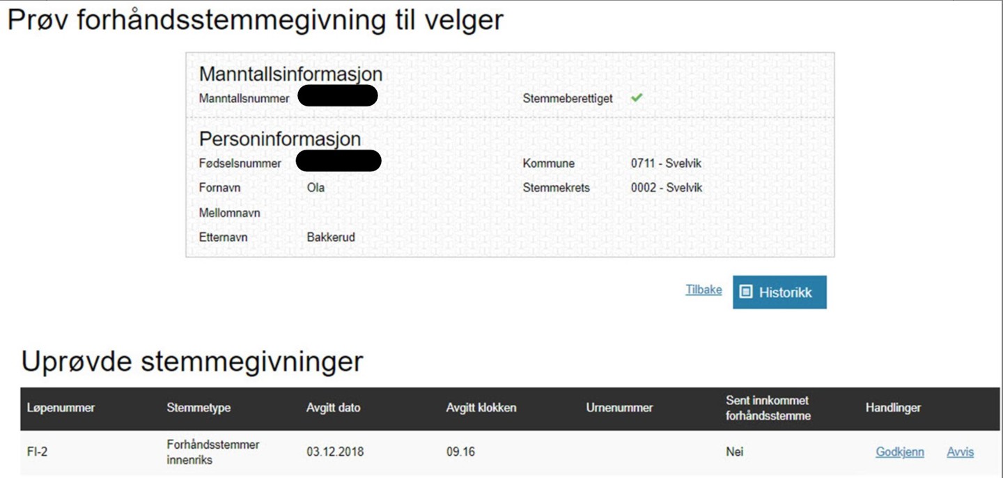 Fra dette personkortet kan du foreta enkeltvis prøving av stemmegivninger knyttet til velgeren.
