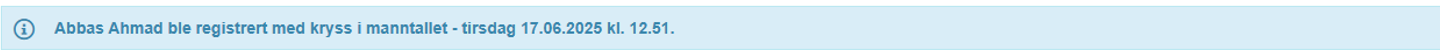 Når du trykker på "Registrer stemmegivning" registreres det at velgeren har avgitt valgtingsstemme. Det settes da et elektronisk kryss i manntallet ved denne velgeren, som indikerer at velgeren har avgitt godkjent stemmegivning på valgting.